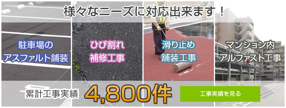 駐車場のアスファルト舗装、マンション内、ひび割れの補修工事など様々のケースに対応した実績がございます。